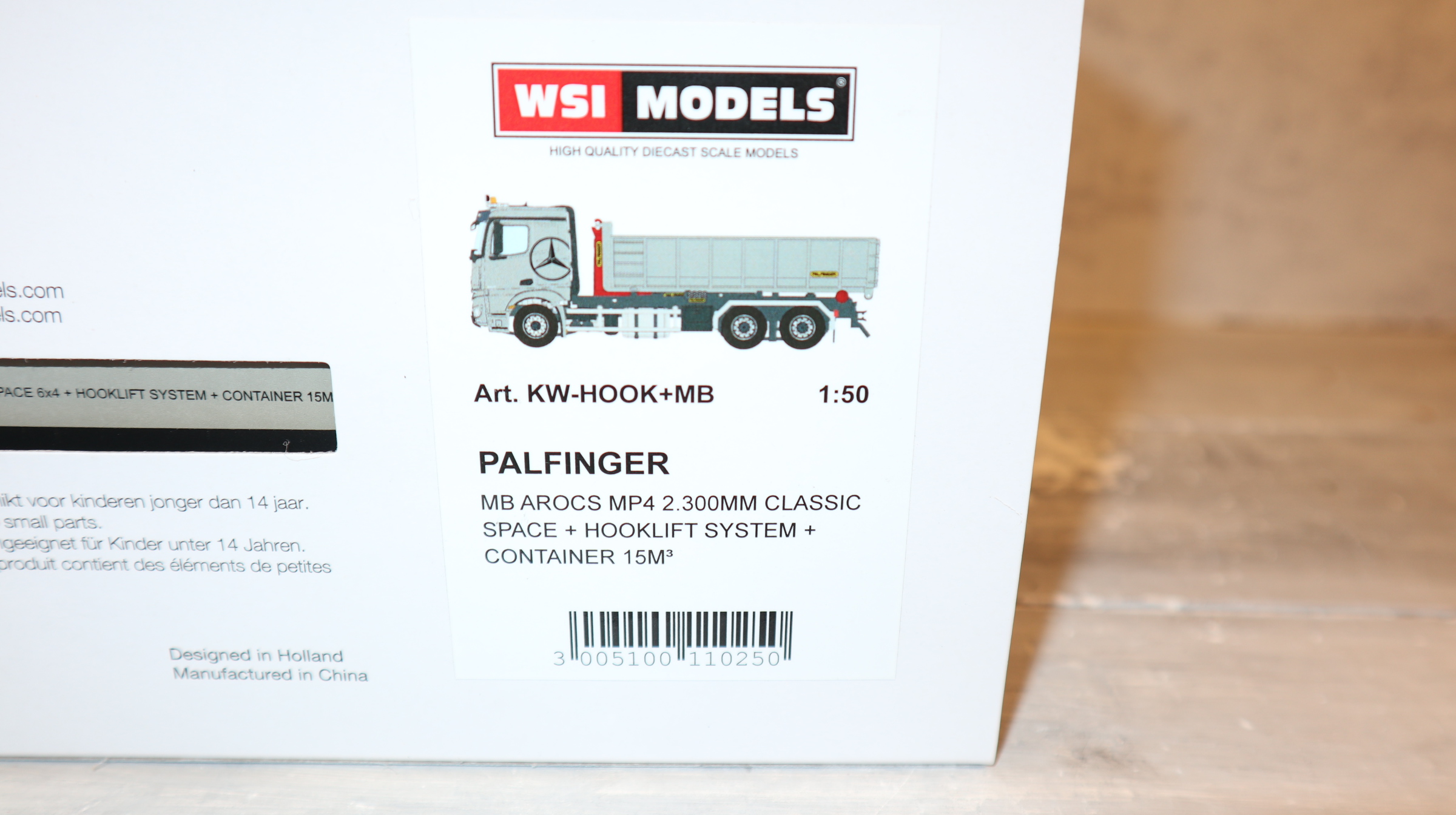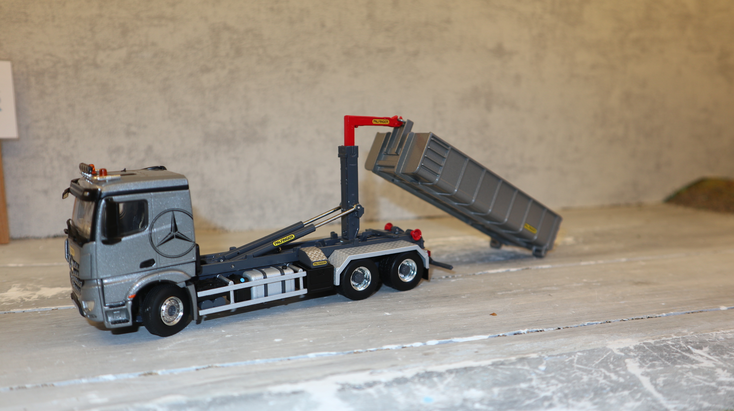 Produktinformationen "WSI 02-3792 in 1:50, MB Arocs MP4 6x4 silber Palfinger Abroller, NEU in OVP"