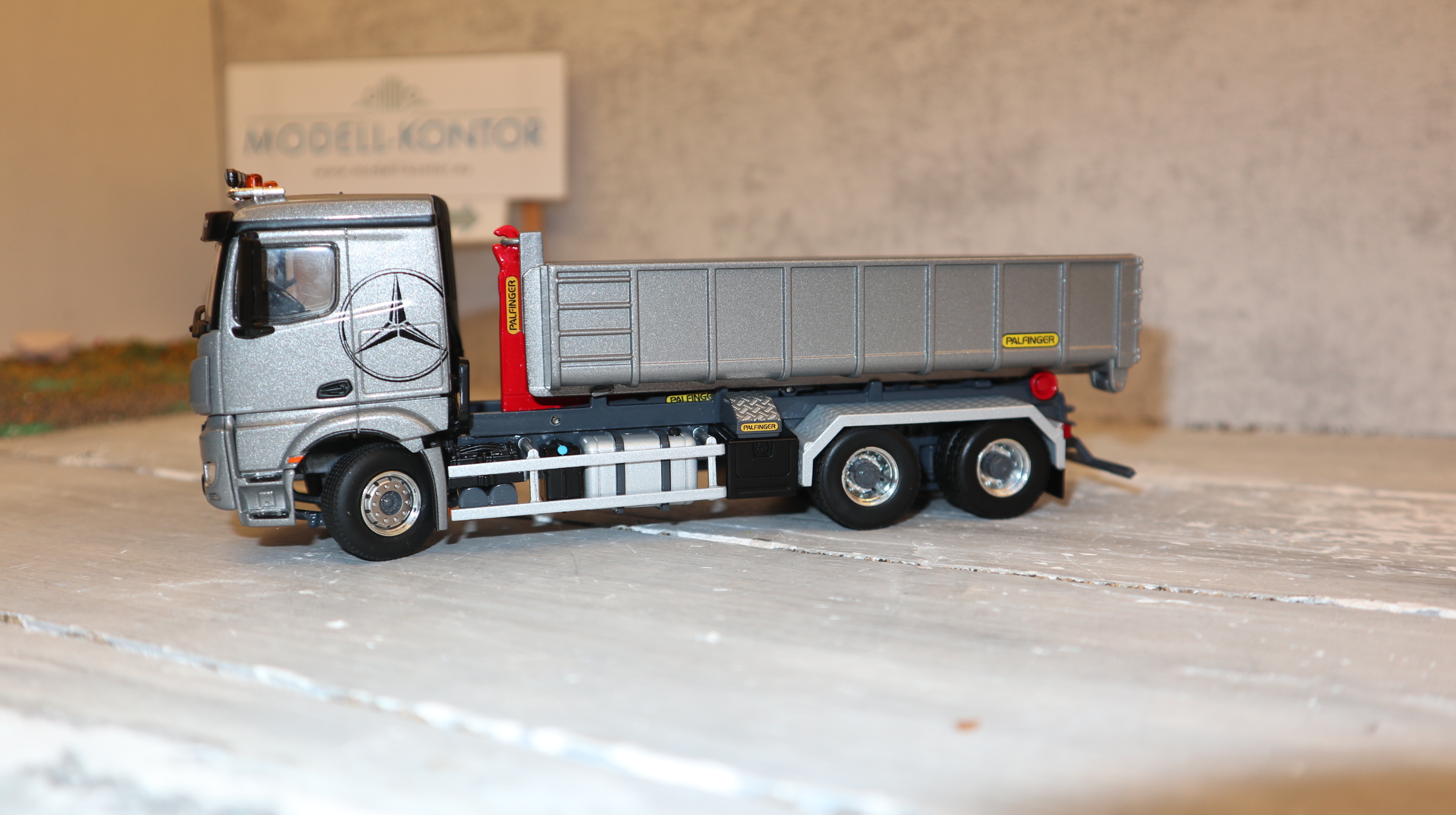 Produktinformationen "WSI 02-3792 in 1:50, MB Arocs MP4 6x4 silber Palfinger Abroller, NEU in OVP"